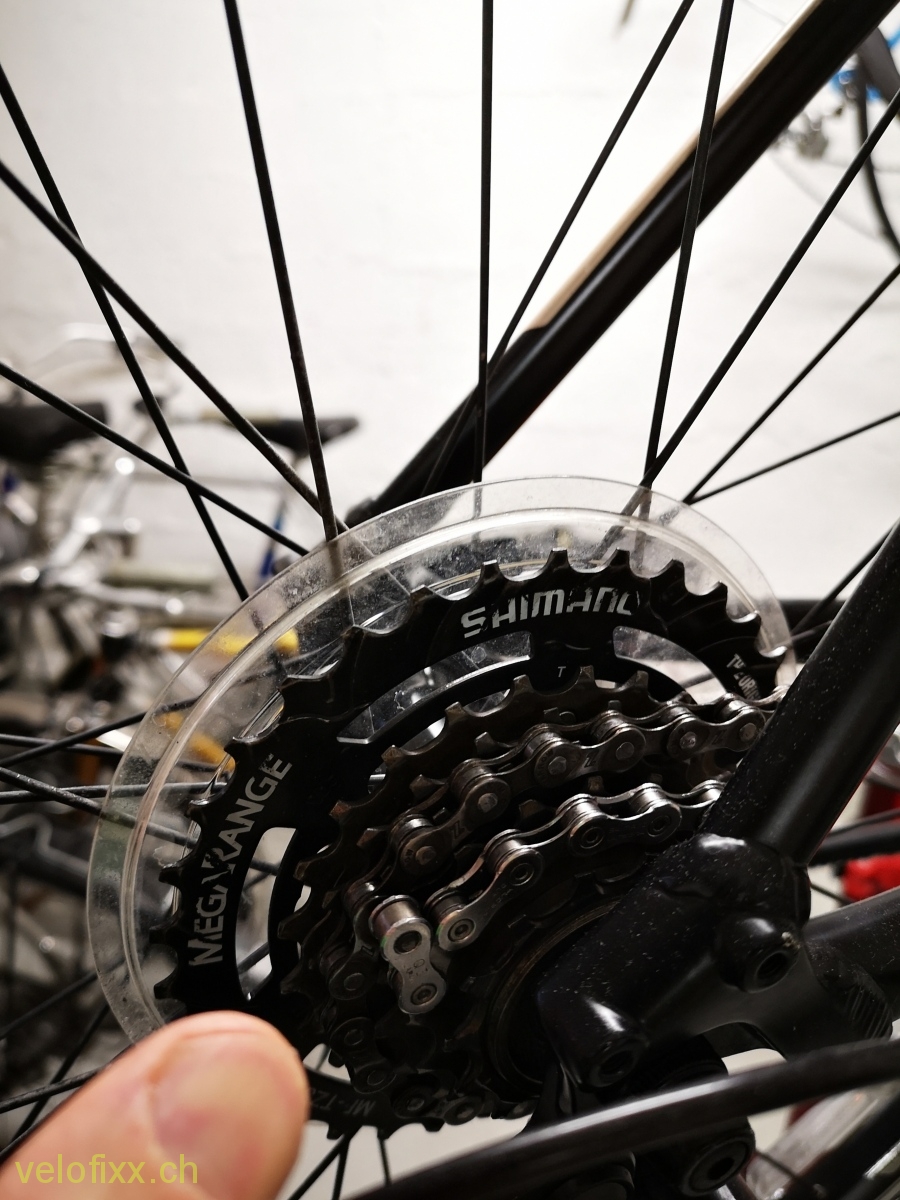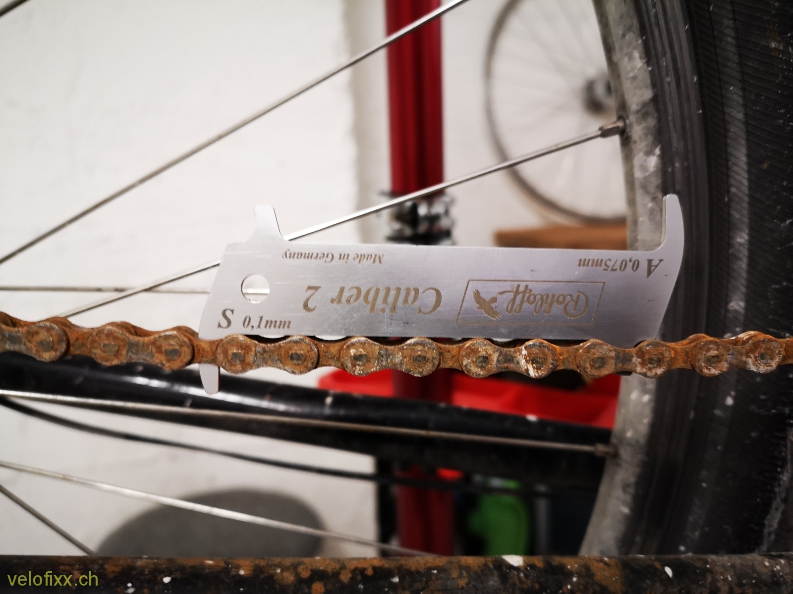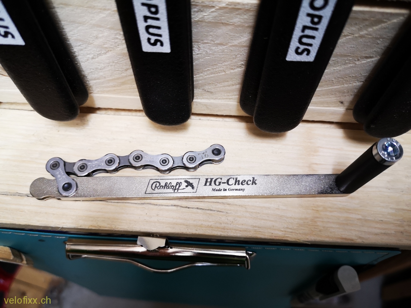 Mit der Kettenmesslehre wird der Verschleiß der Kette überprüft . Und mit der Ritzelverschleißlehre überprüft man den Verschleiß der Kassette. Ebenfalls überprüft werden alle Kettenblätter, Kurbelgarnitur und Funktion des Schaltwerks.