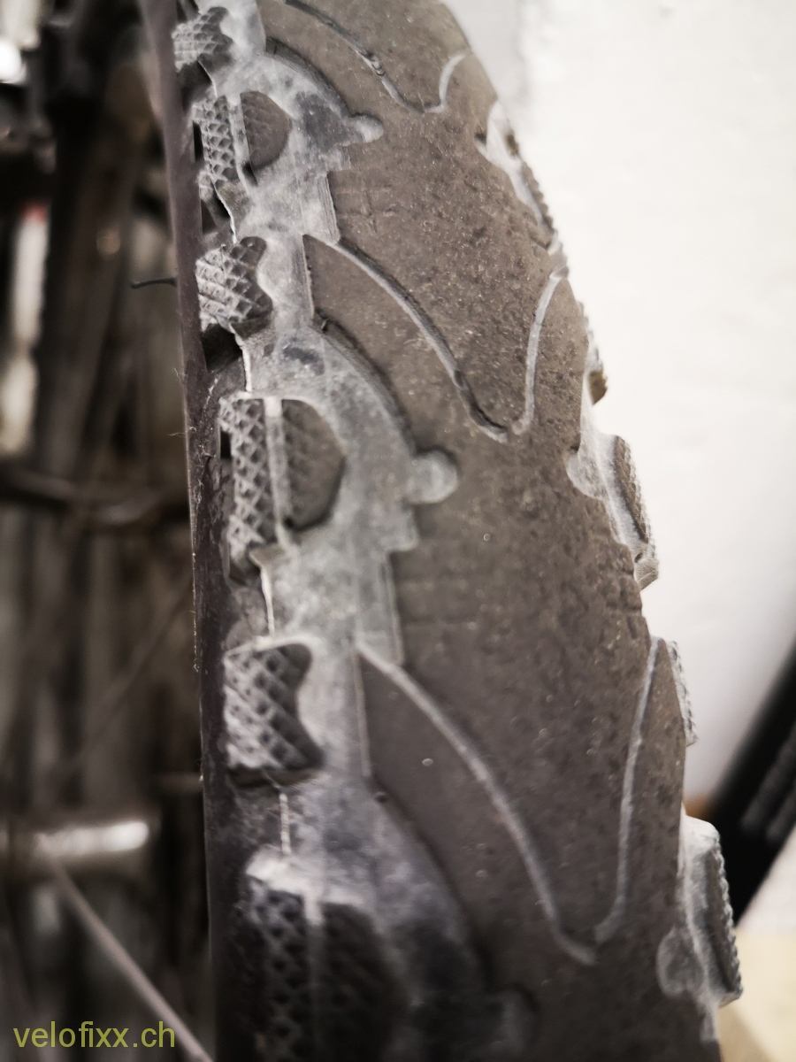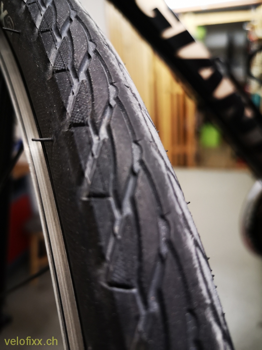 Bereifung Kontrolle vom Reifenprofil, der Lauffläche auf Fremdkörper oder Beschädigung und der Karkasse auf Risse. zurück
